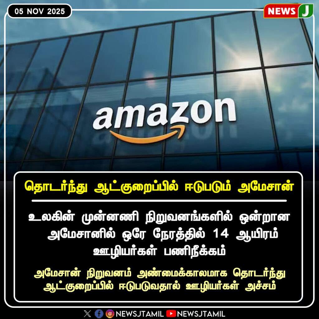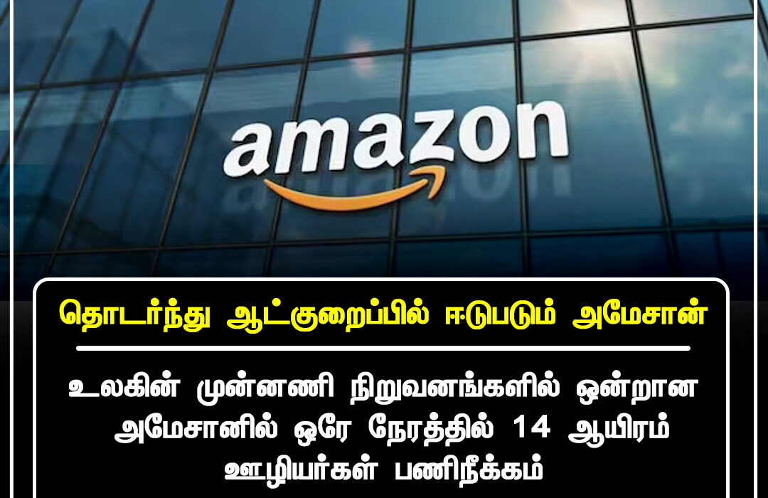 உலகின் முன்னணி நிறுவனங்களில் ஒன்றான அமேசான், கடந்த சில மாதங்களாக ஆட்குறைப்பு நடவடிக்கைகளை தொடர்ச்சியாக மேற்கொண்டு வருகிறது. சமீபத்திய கட்டத்தில், ஒரே நேரத்தில் 14,000க்கும் மேற்பட்ட ஊழியர்கள் பணிநீக்கம் செய்யப்பட்டுள்ளனர். | Global tech giant Amazon has initiated another round of mass layoffs, cutting over 14,000 jobs worldwide as part of its ongoing restructuring efforts.