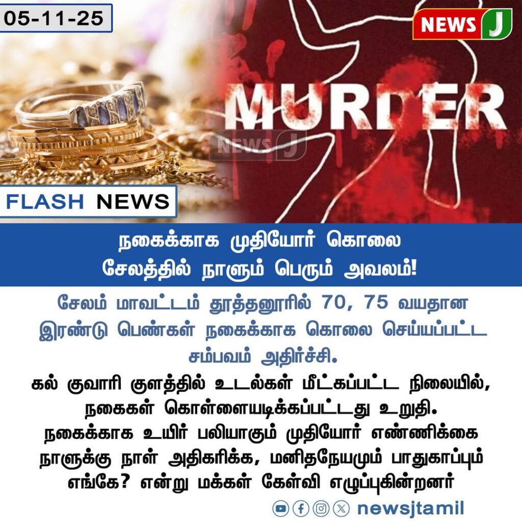 சேலம் மாவட்டம் தூத்தூரில் 70 மற்றும் 75 வயதான இரண்டு பெண்கள் நகைக்காக கொலை செய்யப்பட்ட சம்பவம் அதிர்ச்சியை ஏற்படுத்தியுள்ளது. | A shocking double murder in Salem district has surfaced, where two elderly women, aged 70 and 75, were allegedly killed for jewellery.