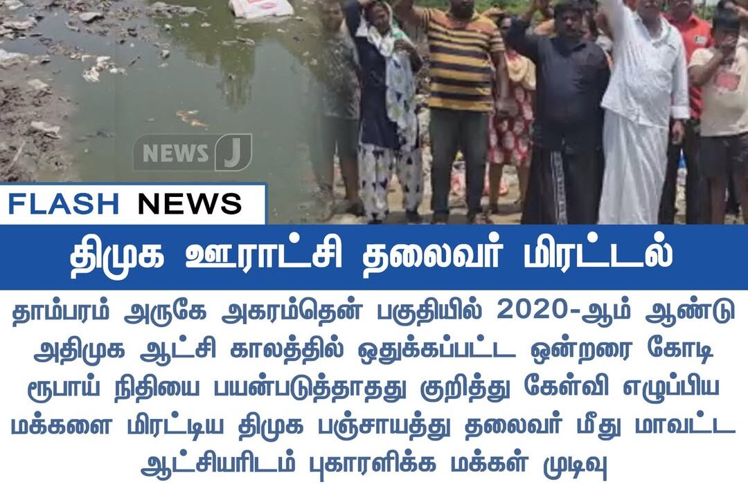 தாம்பரம் அருகே அகரம்தேன் பகுதியில் 2020ஆம் ஆண்டில் அதிமுக ஆட்சிக்காலத்தில் ஒதுக்கப்பட்ட ₹1 கோடி நிதி பயனின்றி இருப்பதாக மக்களிடையே அதிருப்தி நிலவுகிறது. இதை குறித்து கேள்வி எழுப்பிய பொதுமக்கள் மீது திமுக பஞ்சாயத்து தலைவர் மிரட்டல் விடுத்ததாக குற்றச்சாட்டு எழுந்துள்ளது.