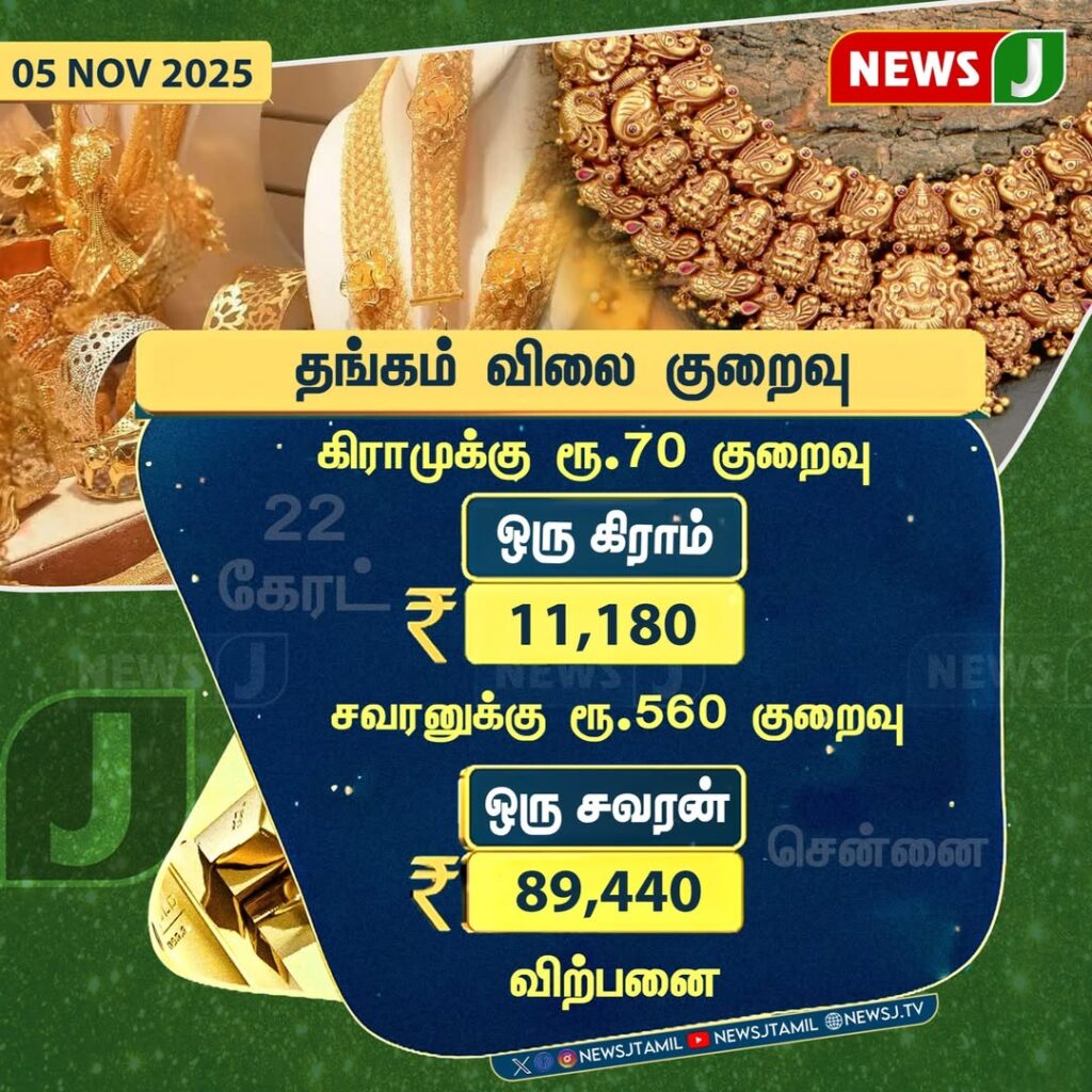 இன்று (நவம்பர் 5, 2025) தங்கம் விலையில் கிராமுக்கு ரூ.70 குறைவு ஏற்பட்டது. இதன் விளைவாக ஒரு கிராம் தங்கத்தின் விலை ரூ.11,180 ஆகவும், ஒரு சவரனின் விலை ரூ.89,440 ஆகவும் நிர்ணயிக்கப்பட்டுள்ளது. வெள்ளி விலையும் ரூ.560 குறைந்துள்ளது.