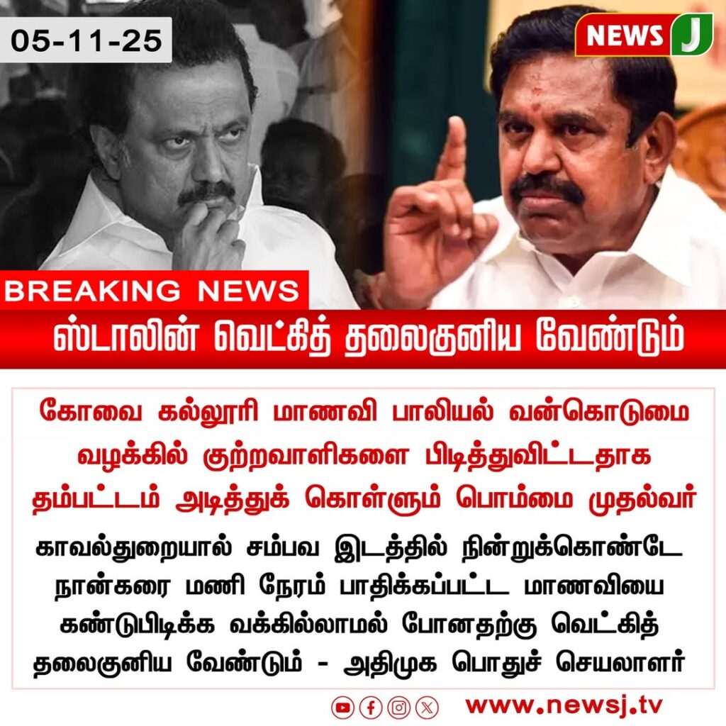 கோவை கல்லூரி மாணவி வன்முறை வழக்கில் குற்றவாளிகள் கைது செய்யப்பட்டதை தொடர்ந்து அரசை கடுமையாக விமர்சித்தார் அதிமுக தலைவர் | AIADMK leader slammed the government over the Coimbatore college student assault case, demanding accountability from the Chief Minister.
