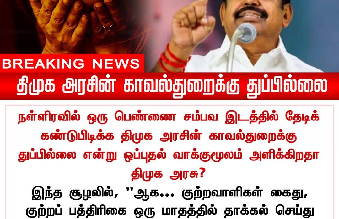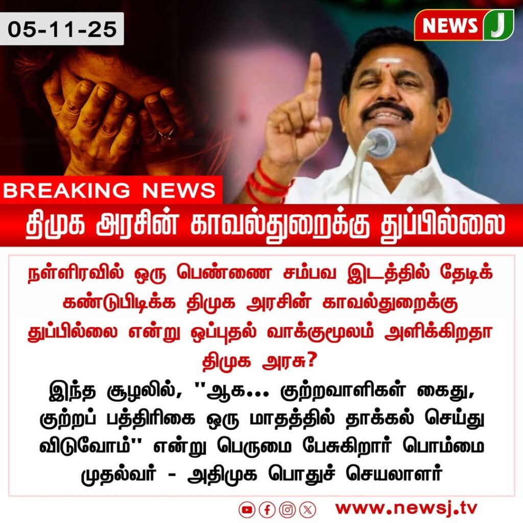 He said it was “shameful” that police failed to locate a missing woman for hours despite repeated alerts. Palaniswami demanded swift justice, warning that if the culprits aren’t punished within a month, the ruling government will face severe public outrage.