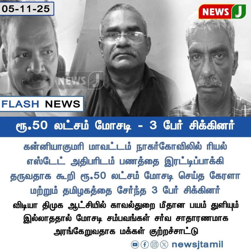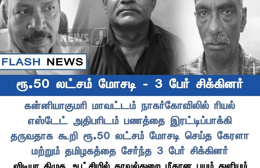 கன்னியாகுமரி மாவட்டம் நாகர்கோவிலில் ஏற்பட்ட பண மோசடி வழக்கில் மூவர் கைது செய்யப்பட்டனர் | Three individuals have been arrested in Nagercoil, Kanyakumari district, in connection with a ₹50 lakh financial fraud.
