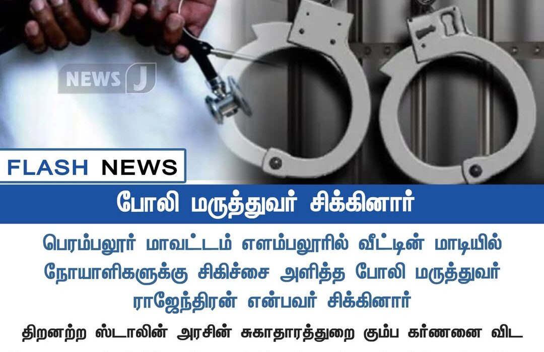 A man named Rajendran was arrested in Perambalur district for running a fake clinic from his house rooftop and offering treatment to patients without any medical qualification. Authorities discovered he had no valid certificates or registration.