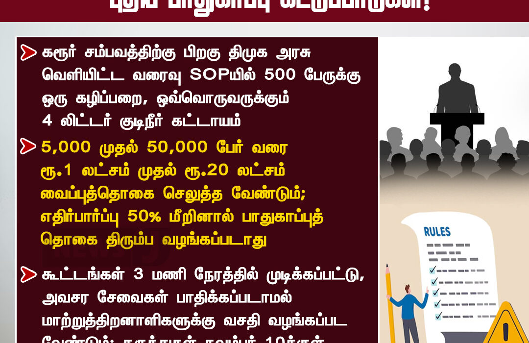 கரூர் சம்பவத்திற்குப் பிறகு திமுக அரசு வெளியிட்ட புதிய பாதுகாப்பு நடைமுறைகளில், 500 பேருக்கு மேற்பட்ட கூட்டங்களுக்கு கட்டாயமாக பாதுகாப்பு அனுமதி பெற வேண்டும் என அறிவிக்கப்பட்டுள்ளது. ஒவ்வொரு அமைப்பும் 4 லிட்டர் குடிநீர் வசதி மற்றும் அவசர மருத்துவ உதவி ஏற்பாடு செய்ய வேண்டும் எனவும் குறிப்பிடப்பட்டுள்ளது.