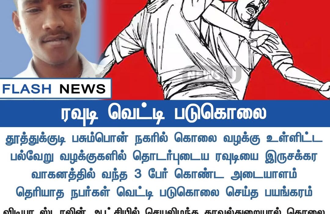 தூத்துக்குடி மாவட்டம் பசும்பொன் நகரில் முந்தைய கொலை வழக்கில் தொடர்புடைய ரவுடியை எதிரிகள் வாக்குவாதத்துக்குப் பிறகு வெட்டி கொலை செய்துள்ளனர். இச்சம்பவத்தில் ரவுடி அடையாளம் தெரியாத நபர்களால் தாக்கப்பட்டு சம்பவ இடத்திலேயே உயிரிழந்தார்.
