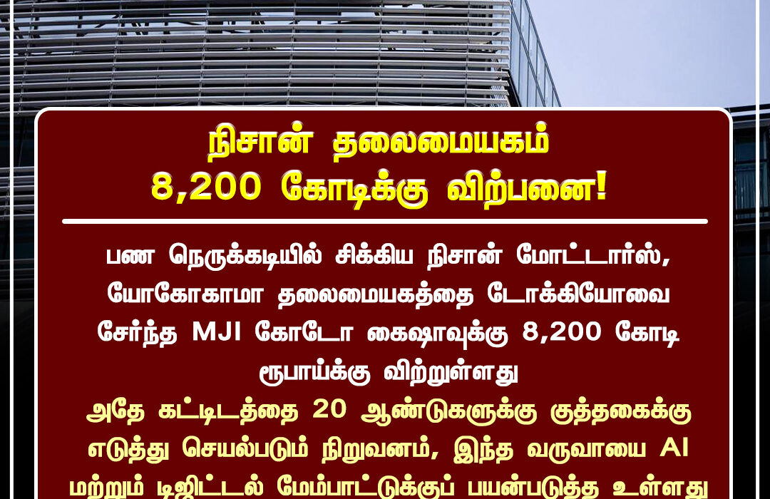 ஜப்பானின் யோகோஹாமாவில் அமைந்துள்ள நிசான் மோட்டார்ஸ் தலைமையக கட்டிடத்தை, MJI கேபிடல் நிறுவனம் 8,200 கோடி ரூபாய்க்கு வாங்கியுள்ளது. விற்பனைக்கு பிறகும், அதே கட்டிடத்தில் 20 ஆண்டுகள் வரை நிசான் நிறுவனம் வாடகைக்கு தொடர அனுமதிக்கப்படும் என ஒப்பந்தத்தில் குறிப்பிடப்பட்டுள்ளது.