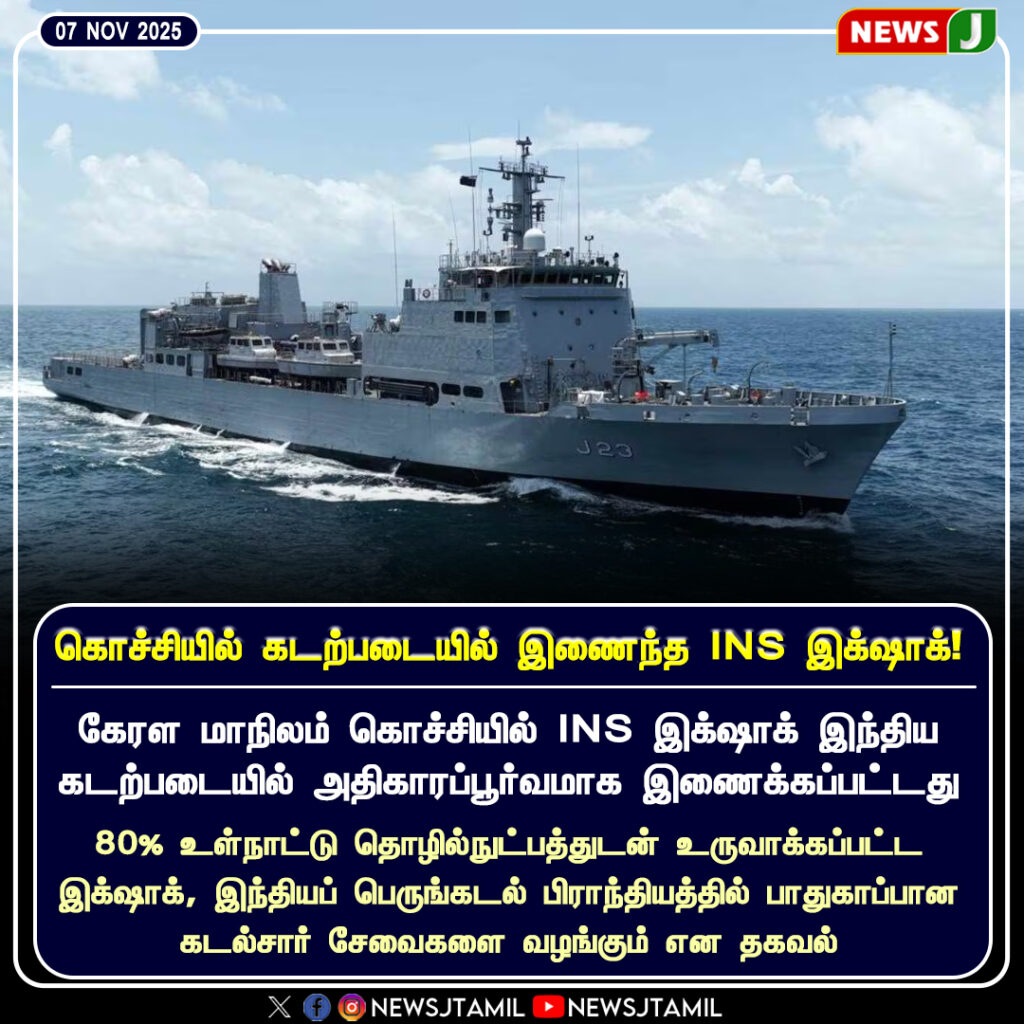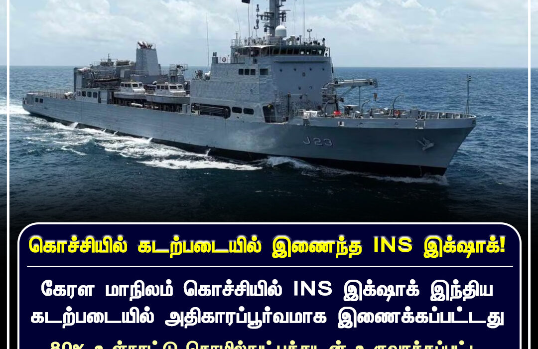 கேரள மாநிலம் கொச்சியில், INS இக்ஷாக் எனப்படும் புதிய கண்காணிப்பு கப்பல், இந்திய கடற்படையில் அதிகாரப்பூர்வமாக இணைக்கப்பட்டது. இந்த கப்பல், நாட்டில் 80% உள்நாட்டு தொழில்நுட்பத்துடன் உருவாக்கப்பட்டதாக கடற்படை தெரிவித்துள்ளது.