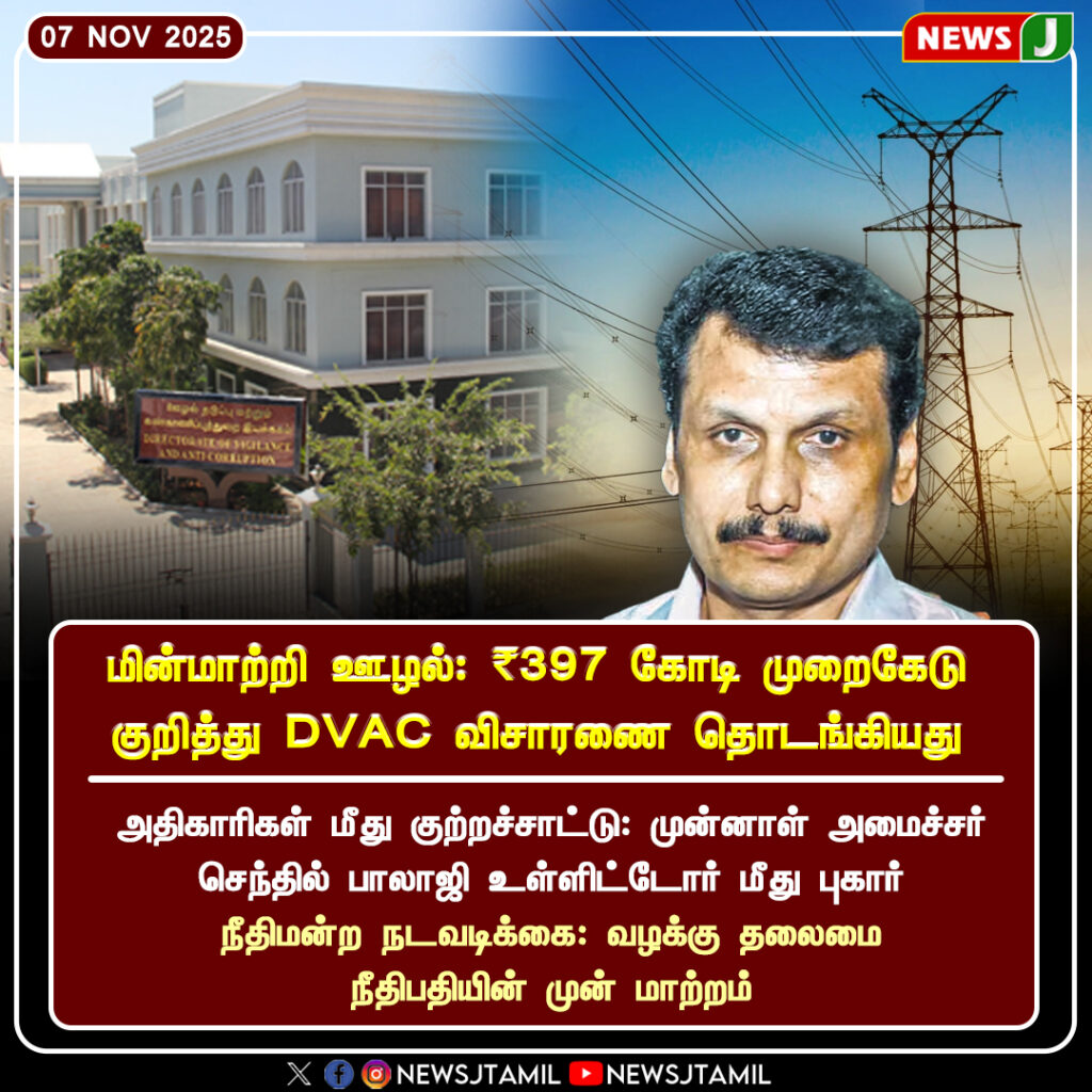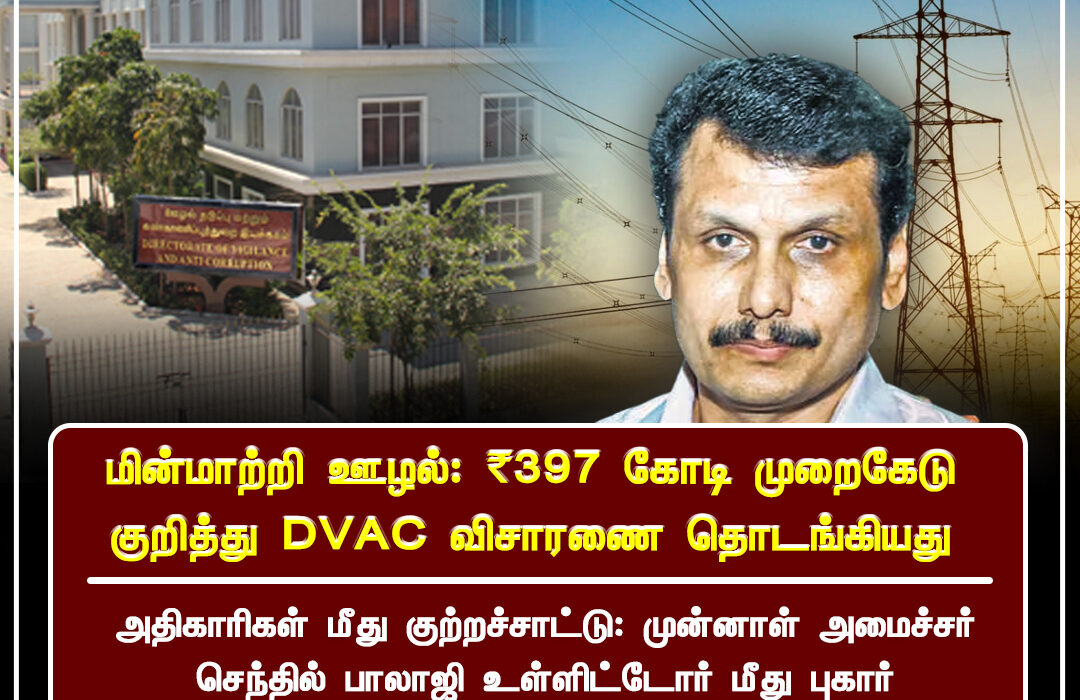 தமிழகத்தில் மின்மாற்றி கொள்முதல் தொடர்பாக ₹397 கோடி ரூபாய் அளவிலான முறைகேடு நடந்தது என்ற குற்றச்சாட்டில் DVAC (அழுத்த விசாரணை மற்றும் ஊழல் தடுப்பு துறை) அதிகாரப்பூர்வமாக விசாரணை தொடங்கியுள்ளது.