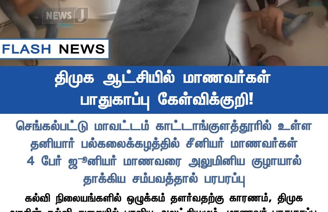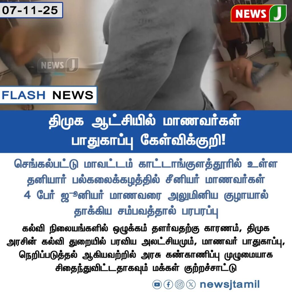 The student has been hospitalized, and the accused have been temporarily suspended. The event has sparked public outrage, with parents questioning the lack of safety measures and administrative accountability in educational institutions under the DMK government.