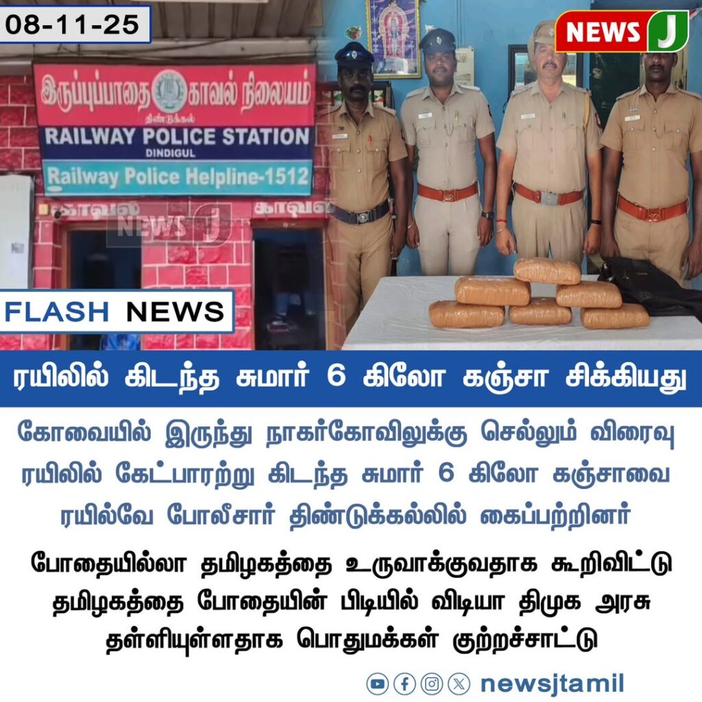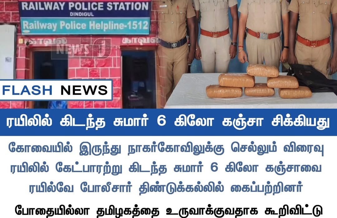 Railway police in Dindigul seized nearly 6 kilograms of ganja left unclaimed in a bag on the Vinayaka Express train traveling from Coimbatore to Nagercoil.