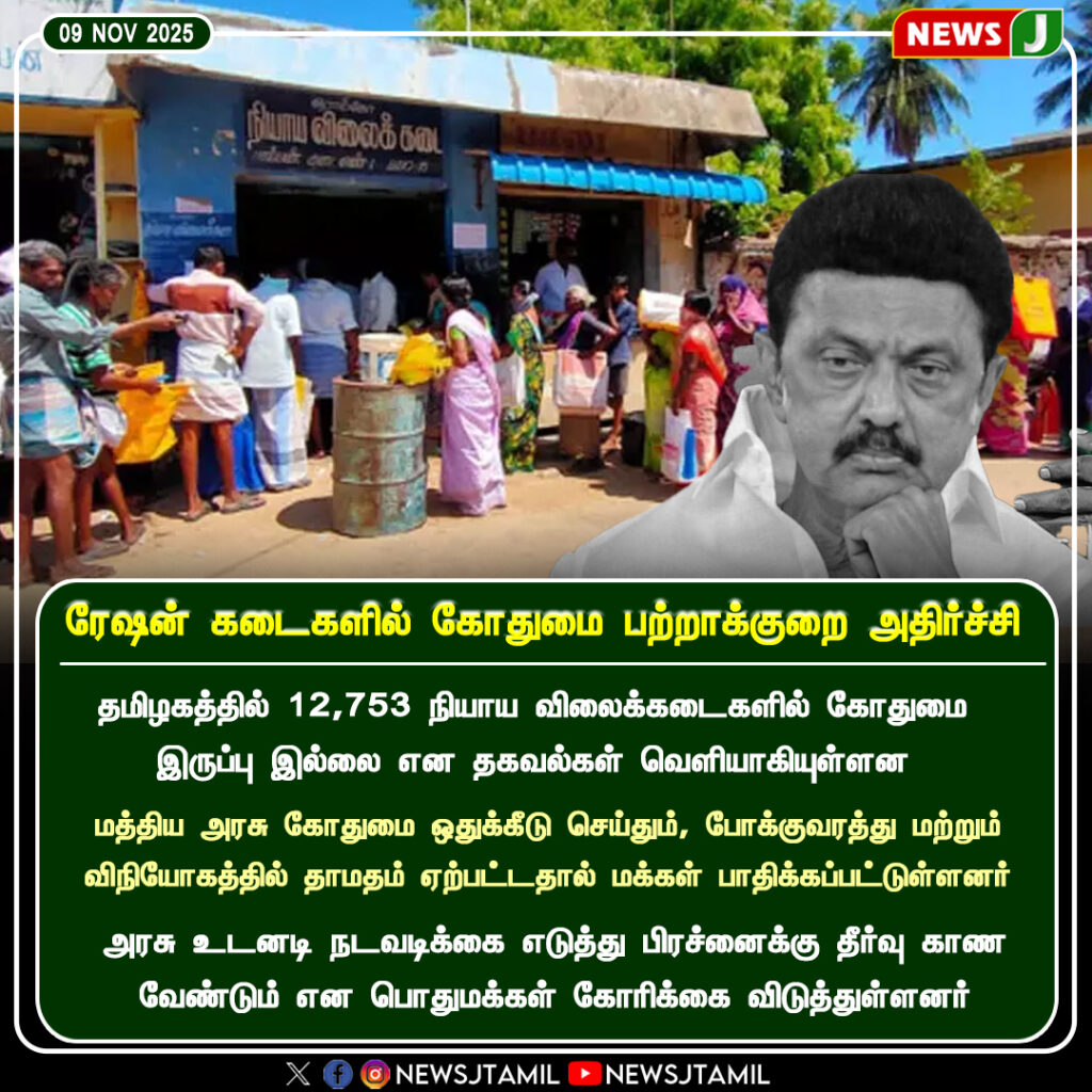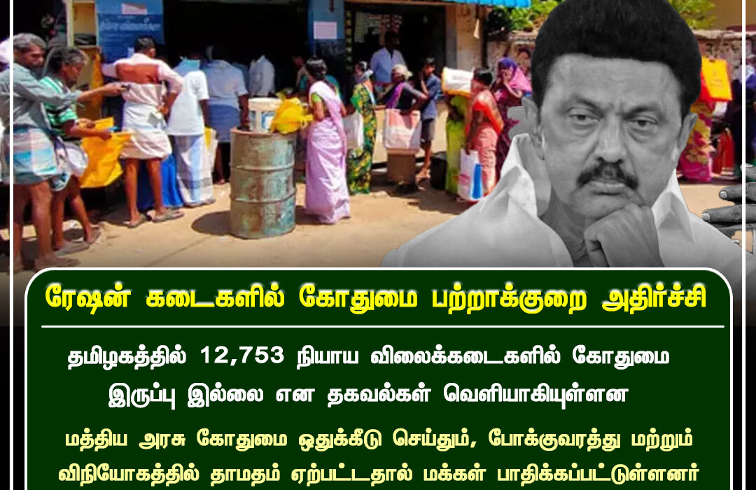 தமிழகத்தின் 12,753 நியாய விலைக்கடைகளில் கோதுமை விநியோகம் தாமதமடைந்தது என்ற தகவல் வெளியாகியுள்ளது. இதனால் பல மாவட்டங்களில் பொதுமக்கள் சிரமத்தை எதிர்கொள்கின்றனர்.
