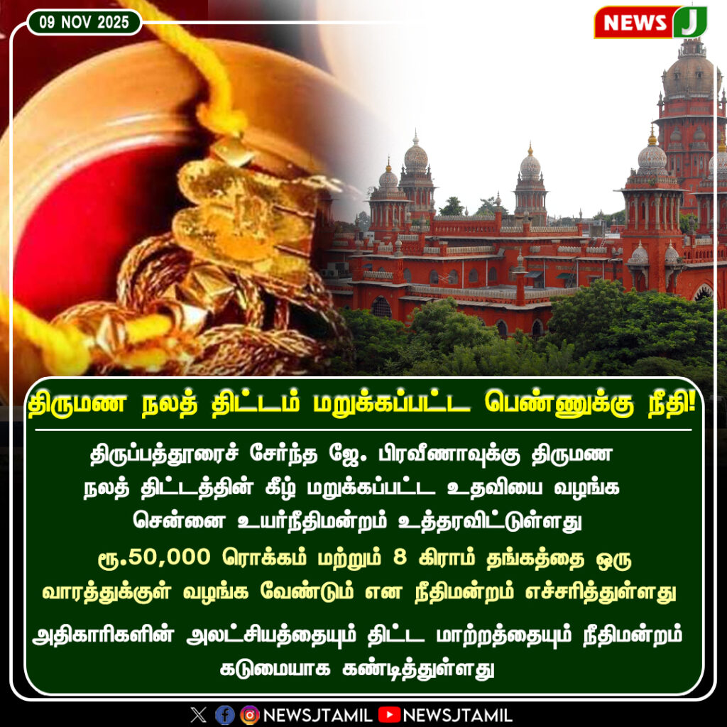 In a major verdict, the Madras High Court ordered the Tamil Nadu government to pay ₹50,000 compensation and 8 grams of gold to a woman whose marriage assistance scheme benefits were wrongfully denied. The court criticized the negligence of officials and emphasized the need for accountability in welfare scheme execution.