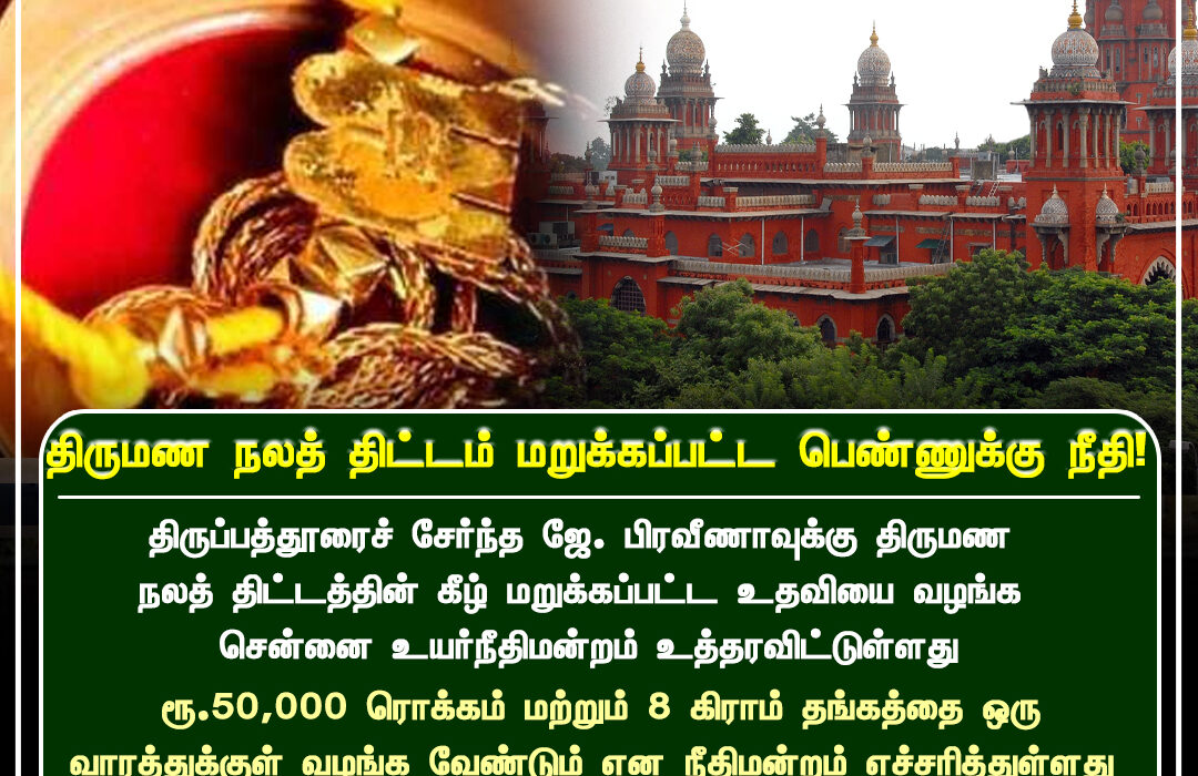 திருப்பத்தூரைச் சேர்ந்த ஜே. பிரிவினாவிற்கு, திருமண நலத் திட்டத்தின் கீழ் மறுக்கப்பட்ட உதவியை வழங்க சென்னை உயர் நீதிமன்றம் உத்தரவிட்டுள்ளது.