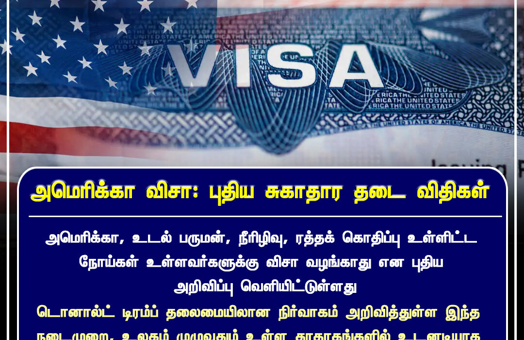 அமெரிக்க அரசு, உடல் பருமன், நீரிழிவு, ரத்தக் கொதிப்பு உள்ளிட்ட நோய்கள் உள்ளவர்களுக்கு விசா வழங்குவது குறித்து புதிய விதிமுறைகளை அறிவித்துள்ளது.