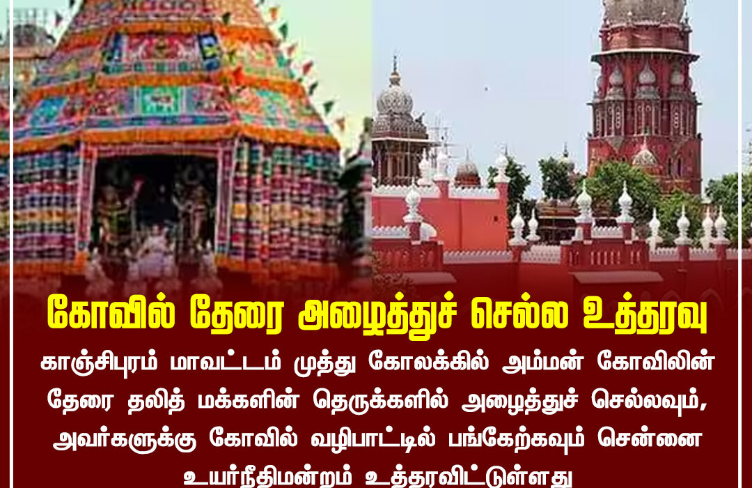 காஞ்சிபுரம் மாவட்டம் முத்து கோவிலில் அம்மன் கோவிலின் தேரை தலித் மக்களின் தெருக்களில் அழைத்துச் செல்லும் வழக்கை தடை செய்திருந்த அதிகாரிகளின் உத்தரவை, சென்னை உயர்நீதிமன்றம் ரத்து செய்துள்ளது.