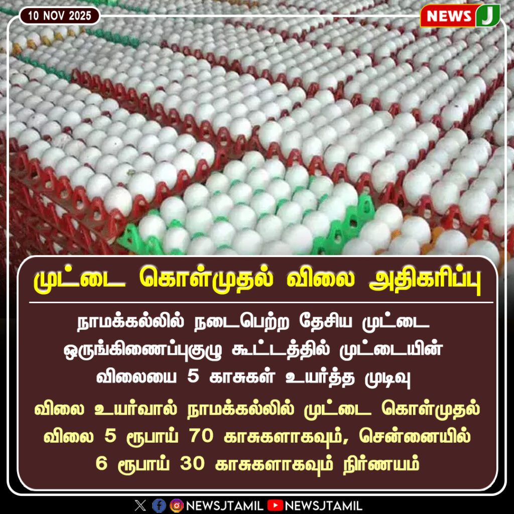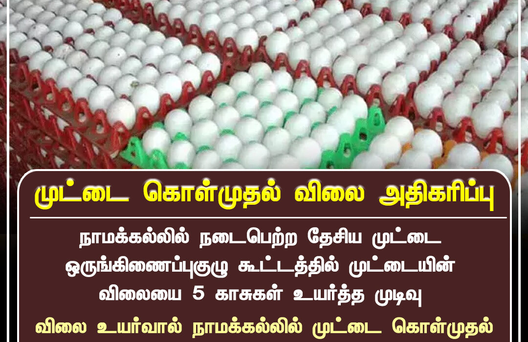 நாமக்கல்லில் நடைபெற்ற தேசிய முட்டை ஒருங்கிணைப்புக் குழு கூட்டத்தில், முட்டையின் கொள்முதல் விலை 5 காசுகள் உயர்த்த முடிவு செய்யப்பட்டது. இதன் மூலம், முட்டை விலை நாமக்கல்லில் ரூ.5.70 ஆகவும், சென்னையில் ரூ.6.30 ஆகவும் நிர்ணயிக்கப்பட்டுள்ளது.