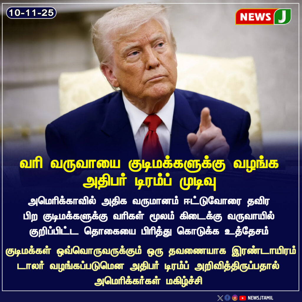 அதிபர் டிரம்ப் கூறியதாவது, “இது குடும்பங்களுக்கு நிதி நிம்மதி அளிக்கும் முக்கியமான முடிவு. வரிச் சுமை குறைவதால் மக்கள் அதிகம் சேமிக்க முடியும்” என தெரிவித்துள்ளார்.