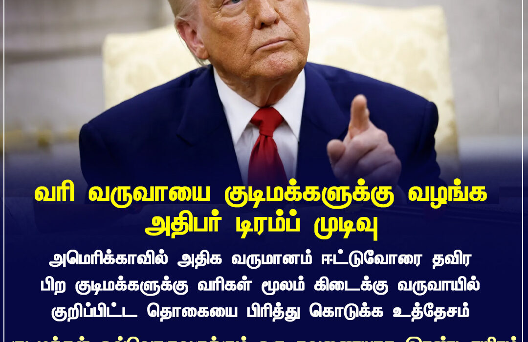 அமெரிக்க அதிபர் டொனால்ட் டிரம்ப், நடுத்தர வருமானக் குடும்பங்களுக்கு வரி வருவாயை மீளளிக்கும் புதிய திட்டத்தை அறிவித்துள்ளார். இந்த திட்டம் மூலம் குடும்பங்களுக்கு நேரடியாக வரிச்சலுகை வழங்கப்படவுள்ளது.