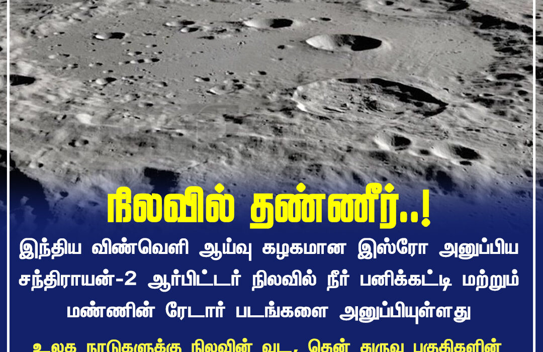 இந்திய விண்வெளி ஆய்வு மையமான இஸ்ரோ, சந்திரயான்-2 ஆர்பிட்டர் அனுப்பிய புதிய தரவுகள் மூலம் நிலவில் தண்ணீர் இருப்பதை உறுதிப்படுத்தியுள்ளது. மண் மாதிரிகள் மற்றும் ரேடார் படங்களின் ஆய்வின் அடிப்படையில், தண்ணீர் பனிக் கட்டிகள் நிலவின் வட துருவத்தில் கண்டறியப்பட்டதாக கூறப்பட்டுள்ளது.