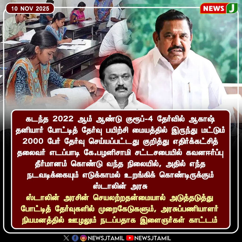 Opposition leader Edappadi K. Palaniswami slammed the DMK government in the Assembly, alleging large-scale irregularities in the 2022 TNPSC Group-4 exams, claiming over 2,000 ineligible candidates took part.