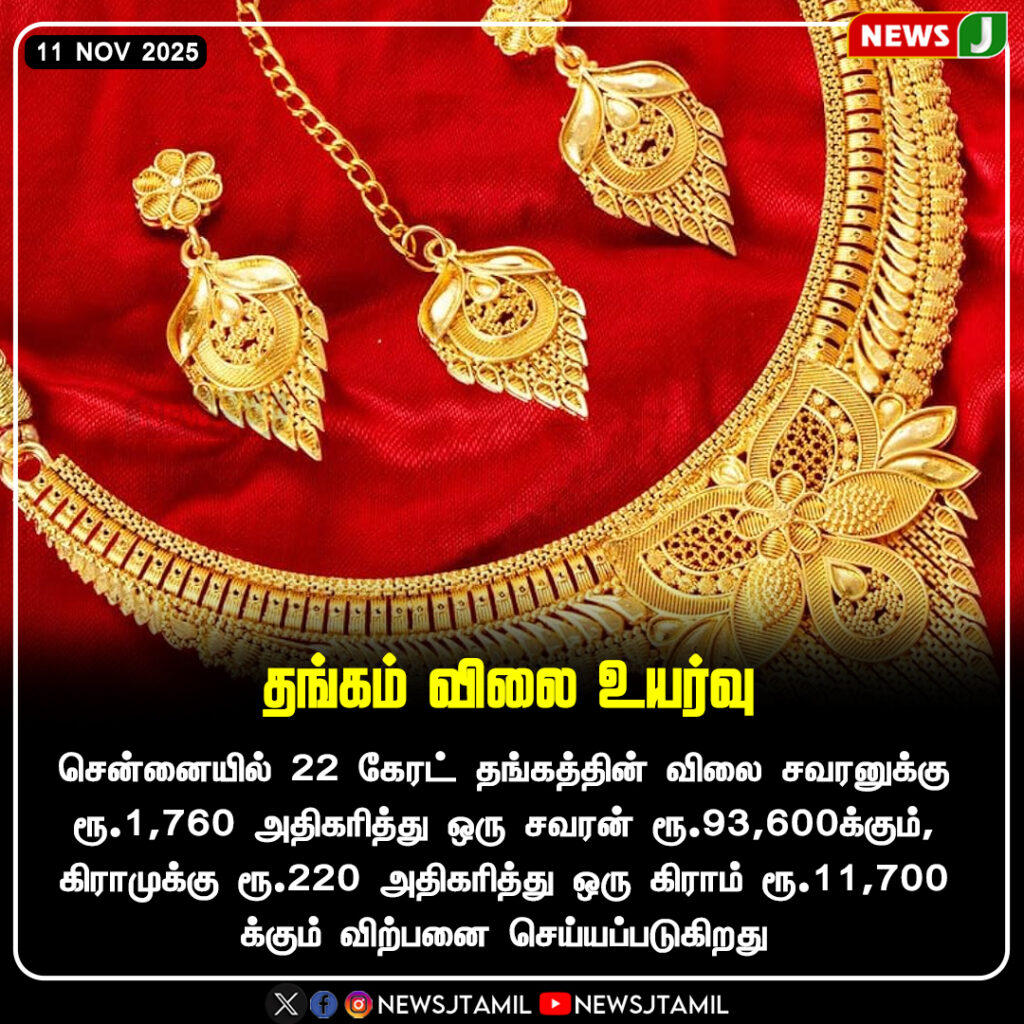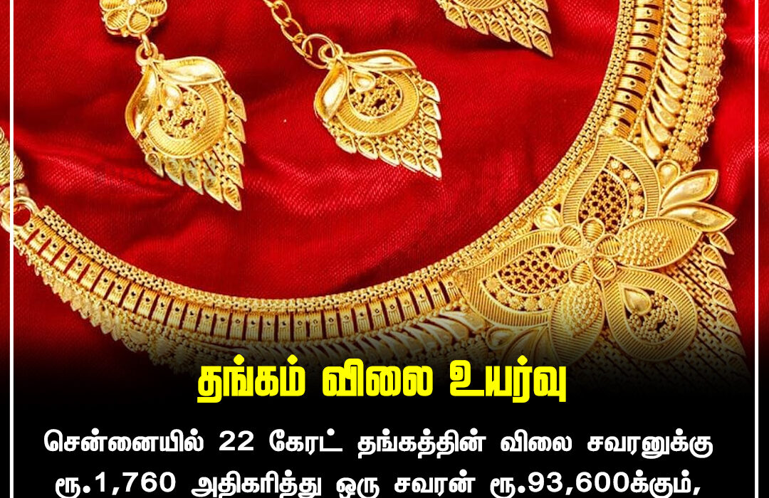 Gold prices in Chennai have increased again, with 22-carat gold now priced at ₹93,600 per sovereign, marking a rise of ₹1,760. Similarly, the price per gram has gone up by ₹220 to ₹11,700.