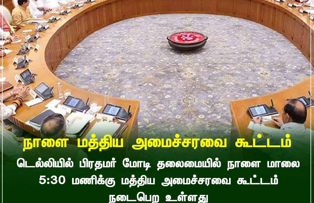 பிரதமர் நரேந்திர மோடி தலைமையில் நாளை மாலை 5.30 மணிக்கு டெல்லியில் மத்திய அமைச்சரவை கூட்டம் நடைபெறவுள்ளதாக தகவல் வெளியாகியுள்ளது. இந்த கூட்டத்தில் பல முக்கிய தீர்மானங்கள் எடுக்கப்படலாம் என அரசியல் வட்டாரங்கள் கூறுகின்றன.