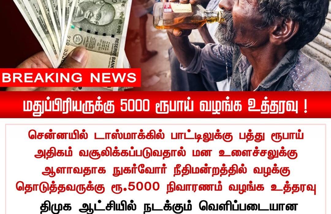 சென்னையில் டாஸ்மாக் கடைகளில் மதுபான விலை அதிகரிக்கப்பட்டதை அடுத்து, மன உளைச்சலுக்காக நுகர்வோர் நீதிமன்றத்தில் வழக்கு தொடர்ந்த நபருக்கு ரூ.5000 இழப்பீடு வழங்குமாறு உத்தரவு பிறப்பிக்கப்பட்டுள்ளது.