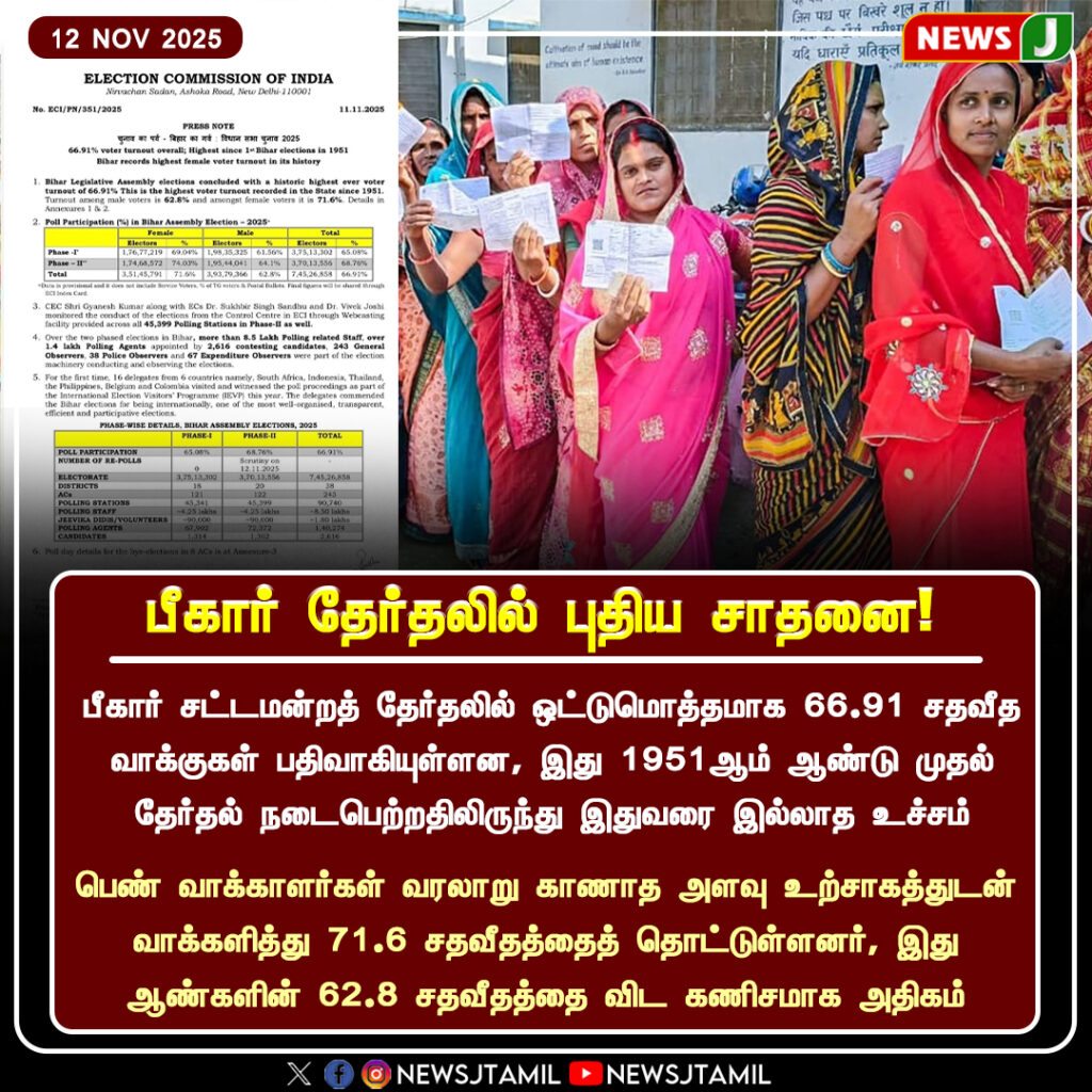 The Election Commission of India announced that Bihar recorded an impressive 66.91% voter turnout in the latest Assembly elections — the highest since the first polls held in 1951.