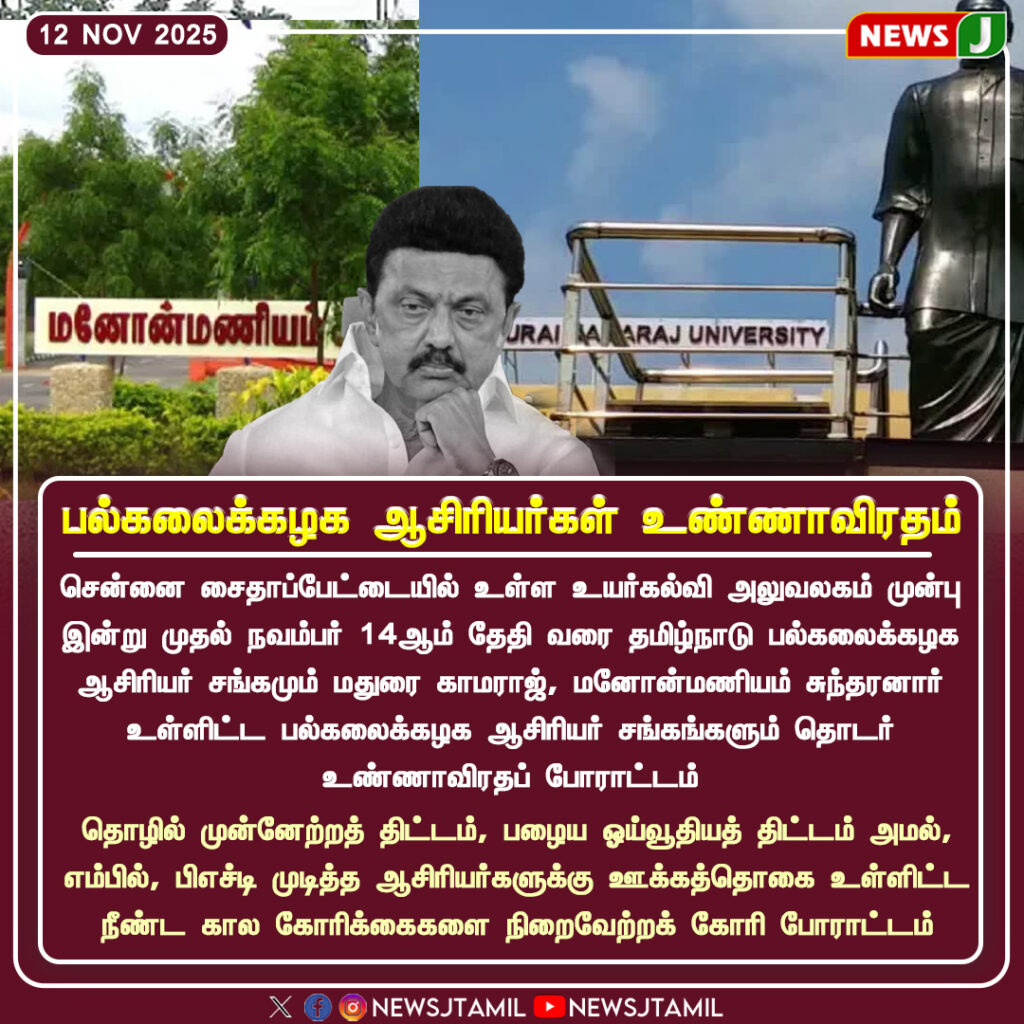 The protest, organized by federations from Madurai Kamaraj University and Manonmaniam Sundaranar University, will continue until November 14. Teachers have warned that if their demands remain unaddressed, they will intensify their agitation across the state.