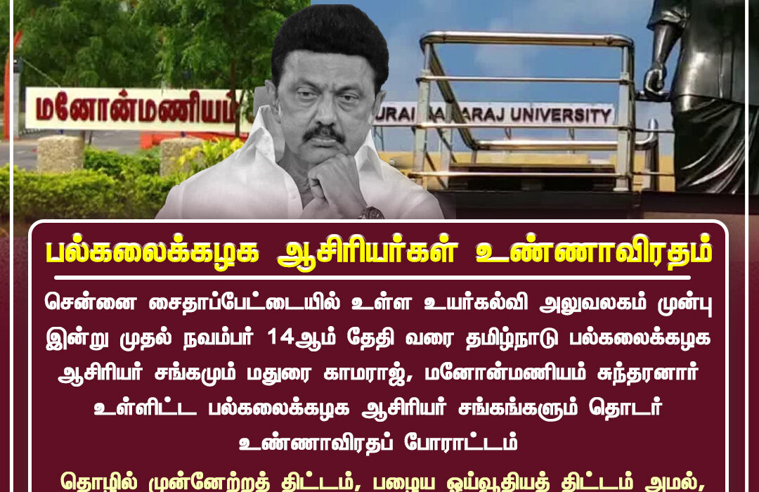 சென்னை சைதாப்பேட்டை உயர் கல்வி அலுவலகம் முன்பு இன்று முதல் நவம்பர் 14 வரை தமிழ்நாடு பல்ல்கலைக்கழக ஆசிரியைர் சங்கமும், மதுரை காமராஜ், மனோன்மணியம் சுந்தரனார் பல்கலைக்கழக ஆசிரியைர் சங்கங்களும் இணைந்து உண்ணாவிரதப் போராட்டத்தில் ஈடுபட்டுள்ளன.