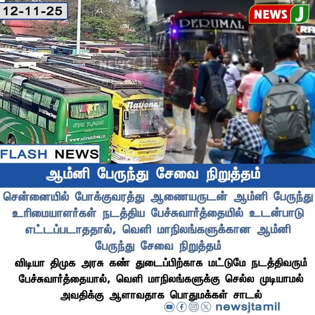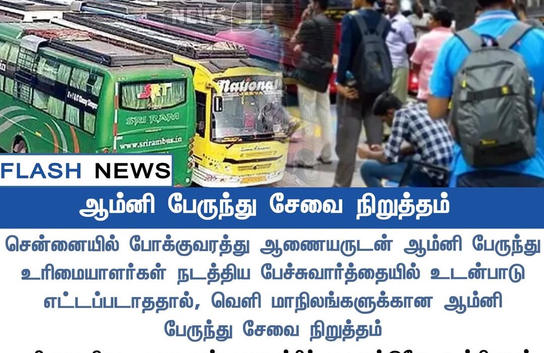 சென்னையில் போக்குவரத்து அதிகாரிகளுடனான ஆலோசனை முடிவுக்கு வராததால், ஆம்னி பேருந்து உரிமையாளர்கள் திடீர் போராட்டத்தில் ஈடுபட்டுள்ளனர். இதனால் வெளிமாநிலங்களுக்கும், மாவட்டங்களுக்கும் செல்லும் ஆம்னி பேருந்து சேவைகள் நிறுத்தப்பட்டுள்ளன.