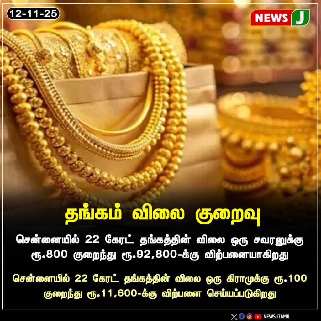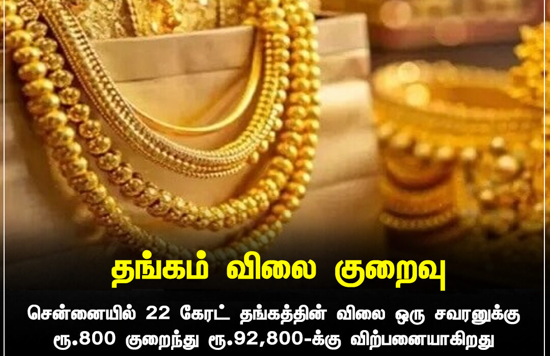 சென்னையில் 22 கேரட் தங்கத்தின் விலை ஒரு சவரனுக்கு ரூ.800 குறைந்து ரூ.92,800 ஆக பதிவானது. தொடர்ந்து பல நாள் உயர்வுக்கு பிறகு ஏற்பட்ட இந்த சரிவு, நுகர்வோருக்கு நிம்மதியை வழங்கியுள்ளது.