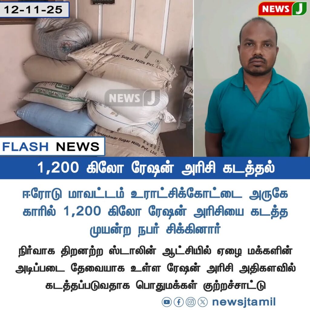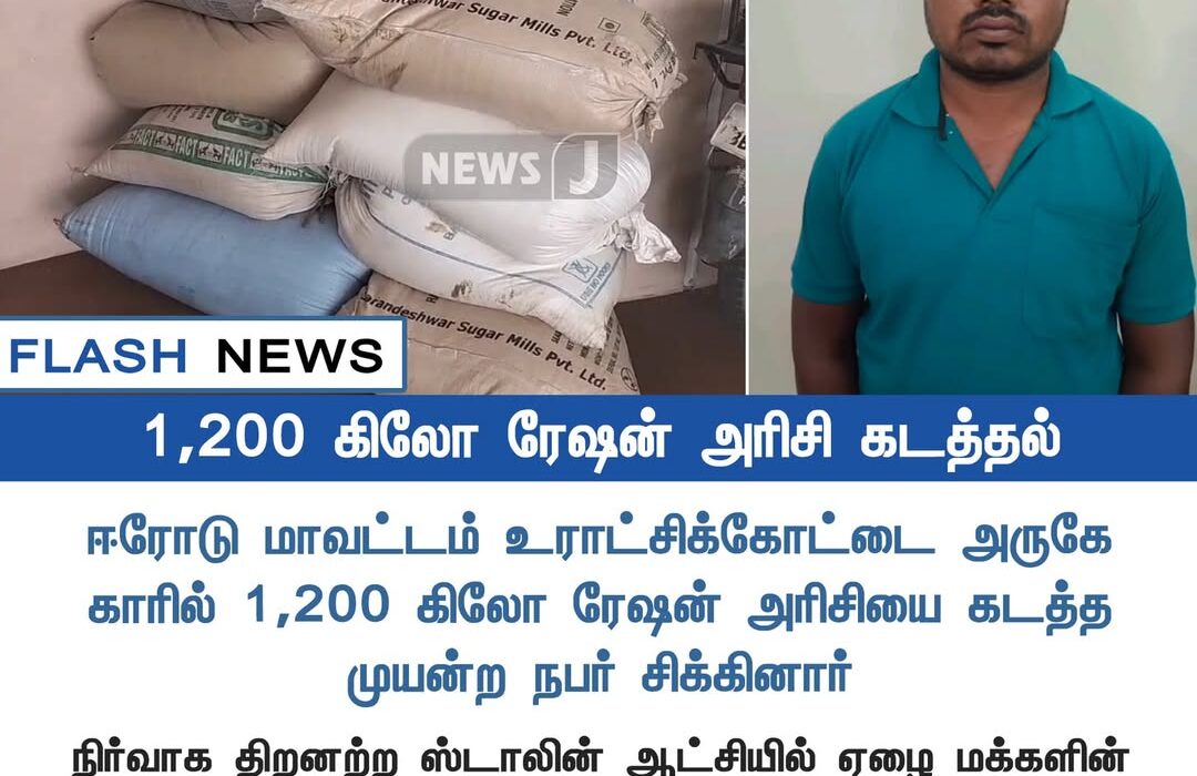 ஈரோடு மாவட்டம் உராட்சிக்கோட்டை அருகே காரில் கடத்தப்பட்ட 1,200 கிலோ ரேஷன் அரிசியை ضبط செய்த போலீசார், மூலநபரை கைது செய்துள்ளனர். அரசு வழங்கும் பொதுத்திராண் அரிசியை கரும்புலத்தில் அதிக விலையில் விற்கும் நோக்கில் கடத்தப்பட்டதாக விசாரணையில் தெரிந்துள்ளது.