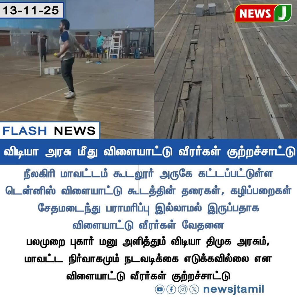 Athletes from the Nilgiris district have complained about the severely damaged condition of the tennis court near Gudalur. They pointed out that broken and uneven wooden flooring poses major safety risks for players during practice and matches.