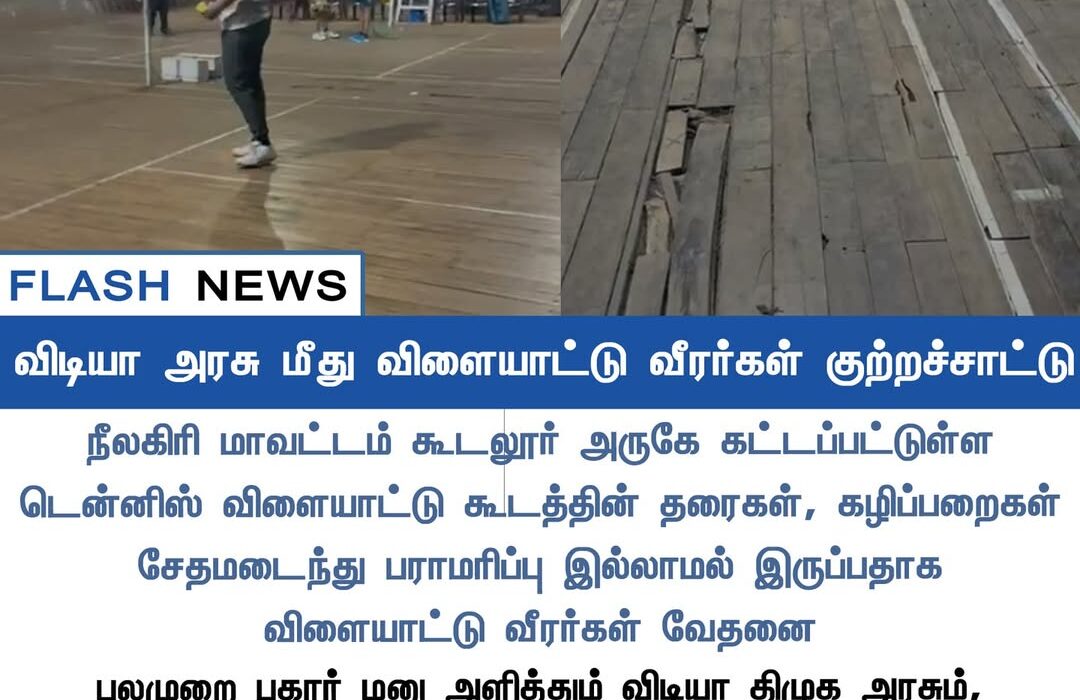 நீலகிரி மாவட்டம் கூடலூர் அருகே அமைந்துள்ள டென்னிஸ் விளையாட்டு கூடத்தின் தரை மற்றும் வசதிகள் மிகவும் சேதமடைந்த நிலையில் இருப்பதாக வீரர்கள் குற்றம் சாட்டியுள்ளனர். பல இடங்களில் மரத்தடிகள் உடைந்தும் பிளந்தும் காணப்படுவதால் விளையாடும் போது விபத்து ஏற்படும் அபாயம் அதிகரித்துள்ளதாக அவர்கள் தெரிவித்துள்ளனர்.