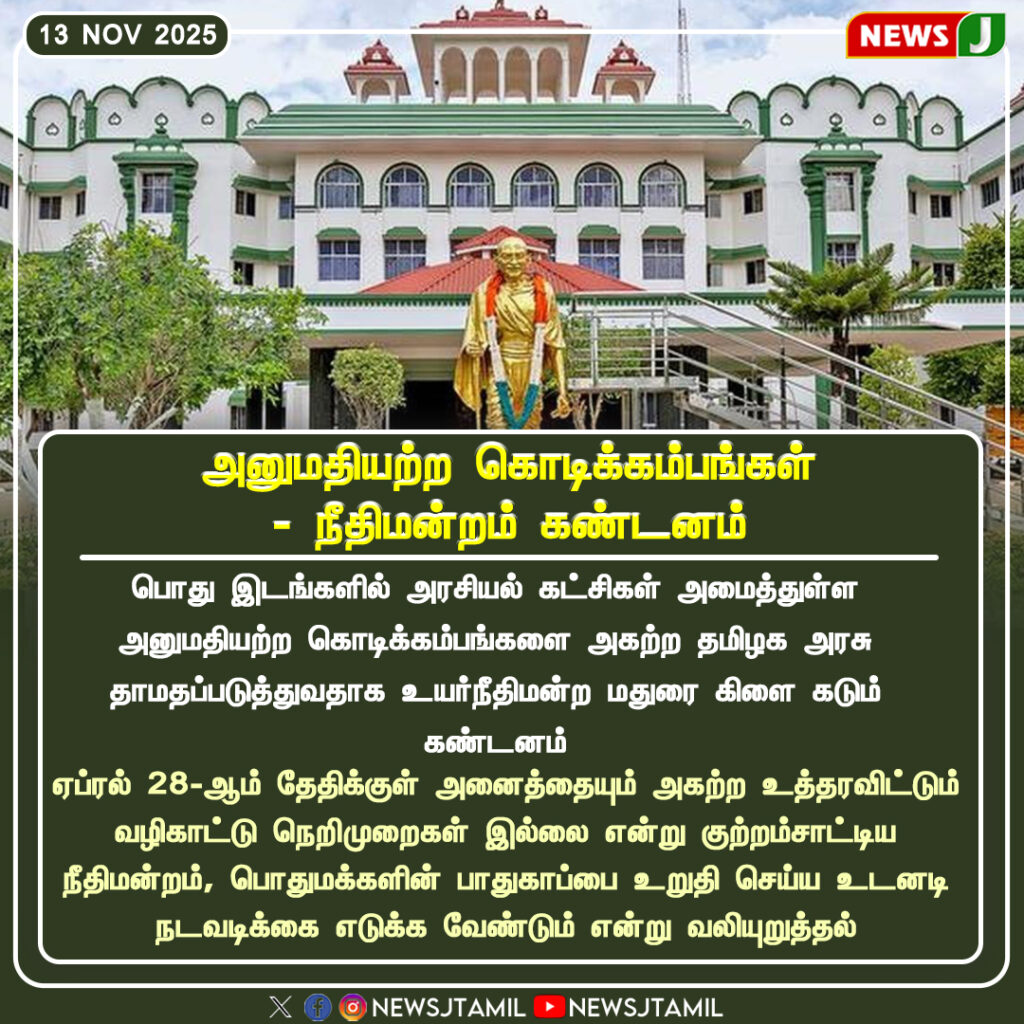 The Madras High Court has expressed serious concern over illegal political flagpoles erected in public places across Tamil Nadu. The court stated clearly that these unauthorised structures must be removed immediately by the state government.