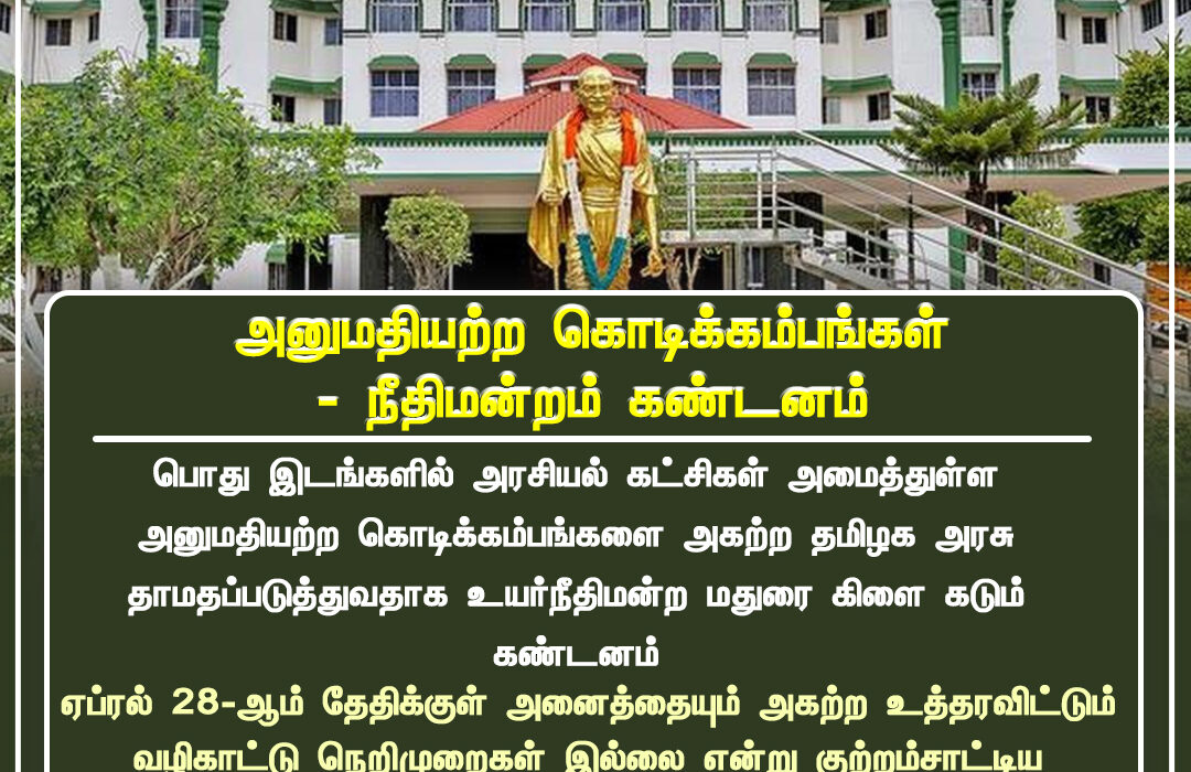 தமிழகத்தில் பொதுஇடங்களில் அரசியல் கட்சிகள் அமைத்துள்ள அனுமதியற்ற கொடிக்கம்பங்கள் குறித்து உயர்நீதிமன்றம் கடும் கவலை வெளியிட்டுள்ளது. இவ்வாறு அனுமதி இல்லாமல் நிறுவப்பட்ட கொடிக்கம்பங்களை உடனடியாக அகற்ற வேண்டும் என்று நீதிமன்றம் தெளிவாக அறிவுறுத்தியுள்ளது.