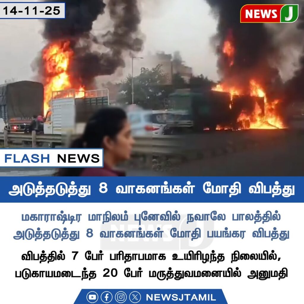 பூனே அருகே நவாலே பாலத்தில் ஏற்பட்ட இந்த பேரவிபத்தில் பல வாகனங்கள் ஒன்றின் மீது ஒன்று மோதி தீப்பற்றியதால் பரபரப்பு நிலவியது. 7 பேர் சம்பவ இடத்திலேயே உயிரிழந்ததாகவும், 20-க்கும் மேற்பட்டோர் பலத்த காயங்களுடன் மருத்துவமனையில் அனுமதிக்கப்பட்டுள்ளதாக தகவல்கள் தெரிவிக்கின்றன.