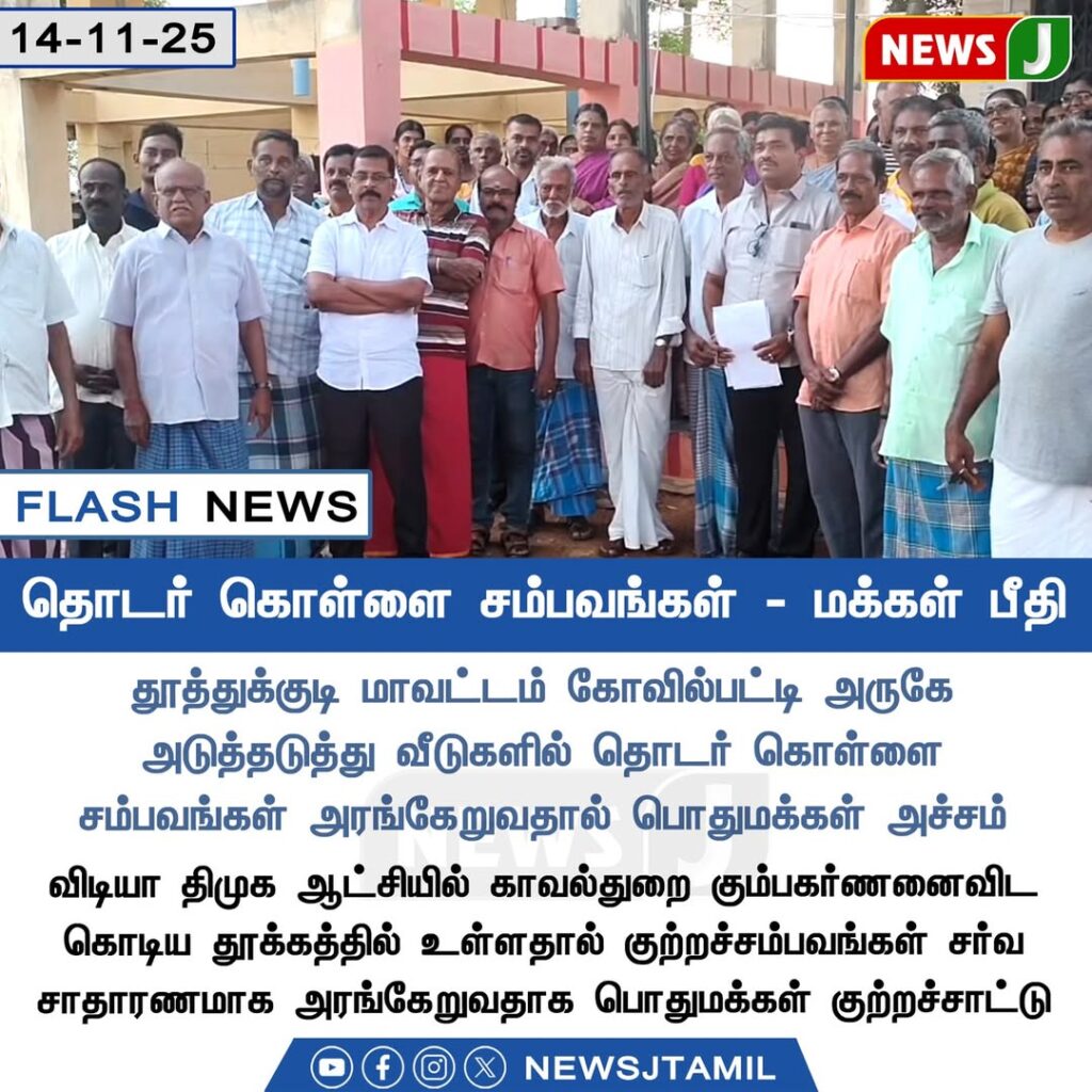 தூத்துக்குடி மாவட்டம் கோவில்பட்டி அருகே பல வீடுகளில் தொடர்ச்சியாக நடைபெறும் கொள்ளைச் சம்பவங்கள் உள்ளூர் மக்களை பெரும் பதட்டத்திற்குள்ளாக்கியுள்ளது. இரவு நேரங்களில் அடைக்கப்பட்ட வீடுகள் உடைக்கப்பட்டு நகை, பணம் உள்ளிட்ட மதிப்புள்ள பொருட்கள் திருடப்பட்டுள்ளதாக புகார்கள் அதிகரித்து வருகின்றன.