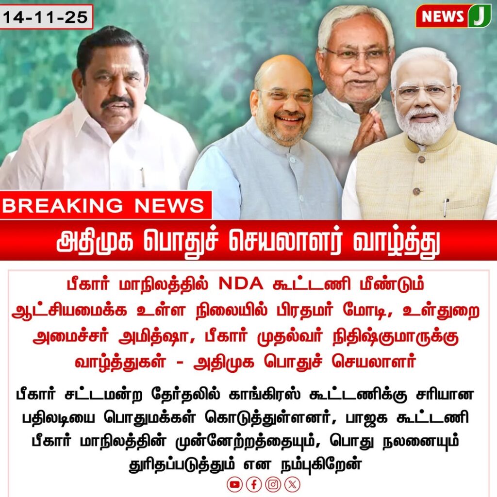 பீகார் மாநிலத்தில் NDA கூட்டணி மீண்டும் ஆட்சியமைக்கும் நிலையில், பிரதமர் மற்றும் மத்திய அமைச்சர்கள் எடுத்துள்ள தீர்மானத்துக்கு அதிமுக பொதுச் செயலாளர் வாழ்த்து தெரிவித்துள்ளார்.