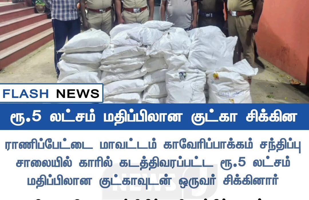 Police in Ranipet district seized gutkha worth ₹5 lakh during a routine vehicle check.