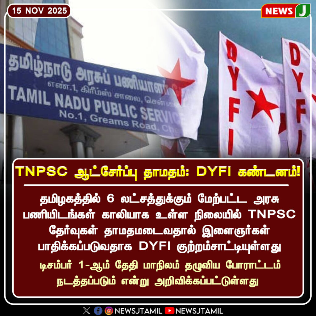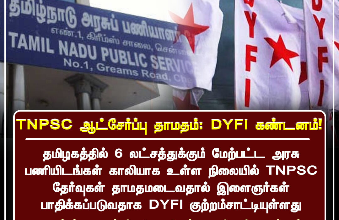 DYFI has strongly condemned the continuous delay in TNPSC examinations, stating that it has severely affected nearly 6 lakh job aspirants across Tamil Nadu. Despite a huge number of government vacancies, the recruitment process has not moved forward.