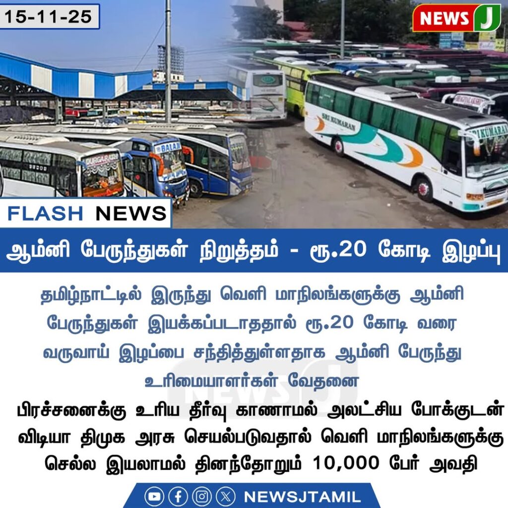 Private omni buses operating between Tamil Nadu and other states have been halted, causing an estimated ₹20 crore daily revenue loss, according to operators.