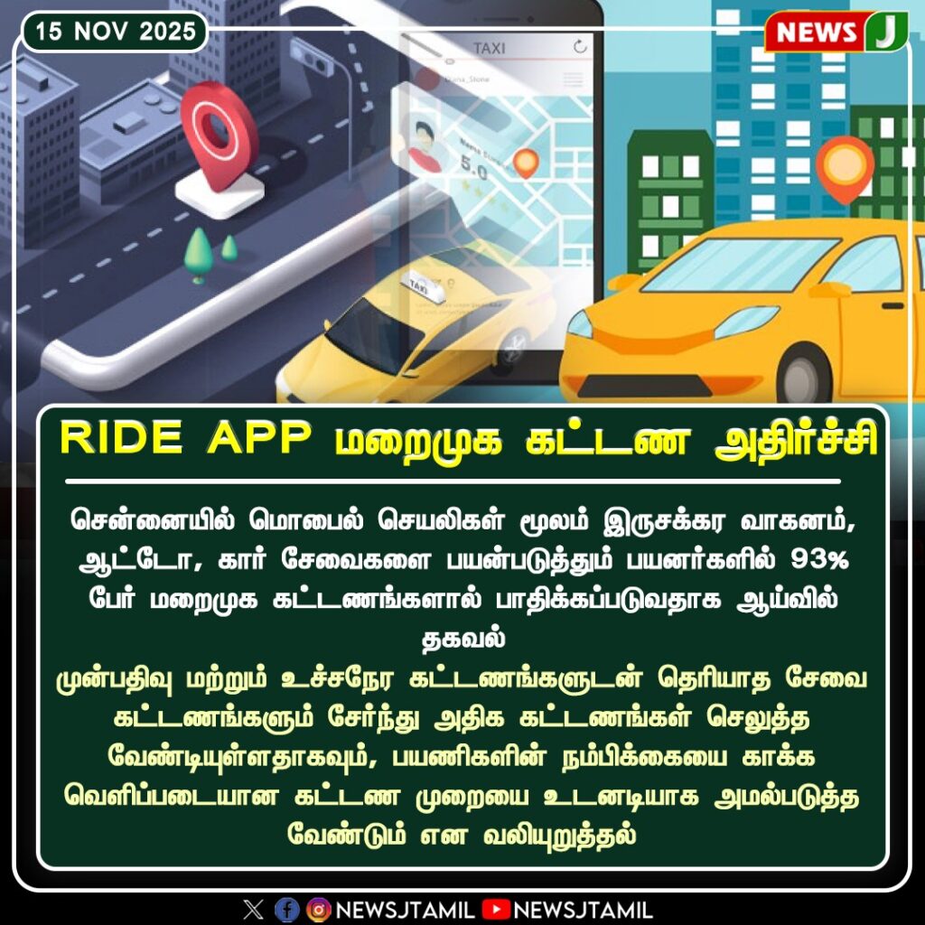 சென்னையில் மொபைல் சேவைகள் மூலமாக இருசக்கர வாகனம், ஆட்டோ, கார் சேவைகளைப் பயன்படுத்தும் பயணிகளில் 93% பேர் மழைமுக கட்டண உயர்வால் கடும் பாதிப்புக்குள்ளாகியுள்ளனர் என ஆய்வு தகவல்கள் தெரிவிக்கின்றன.