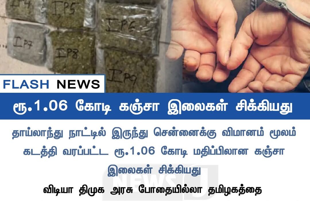Customs officials in Chennai seized ganja leaves worth ₹1.06 crore that were being smuggled from Thailand through an incoming flight. The seizure created a major stir at the Chennai International Airport.