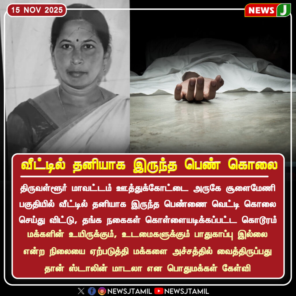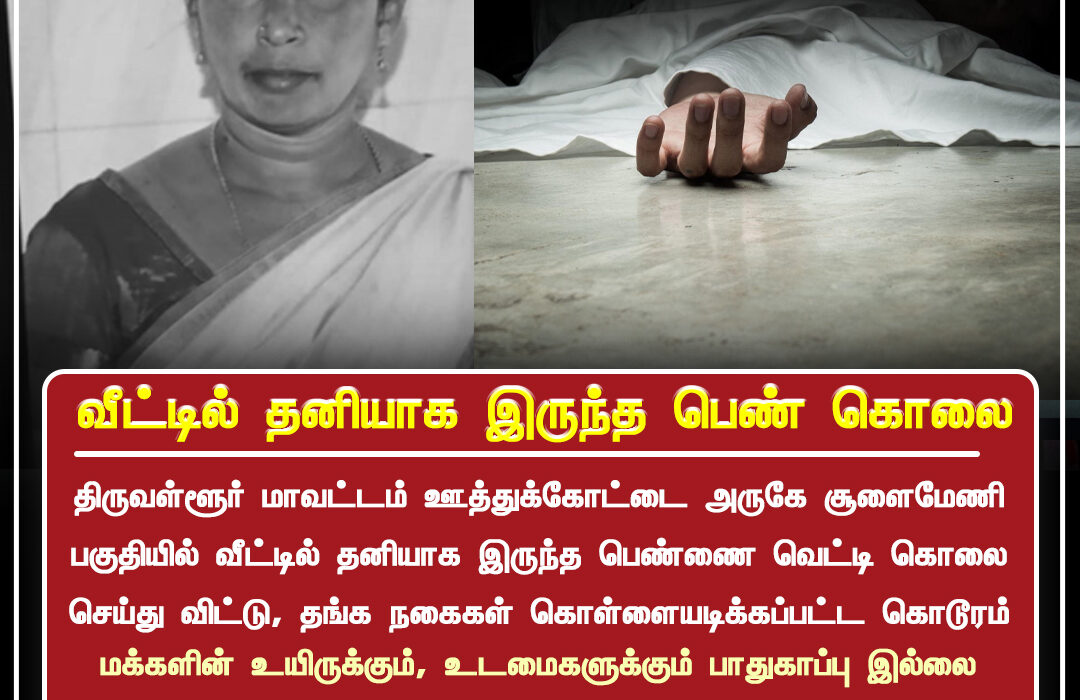 A woman staying alone at her residence near Uthukottai in Tiruvallur district was found murdered, causing widespread shock in the locality. Police investigation suggests that jewellery was stolen, indicating a possible planned robbery-murder.
