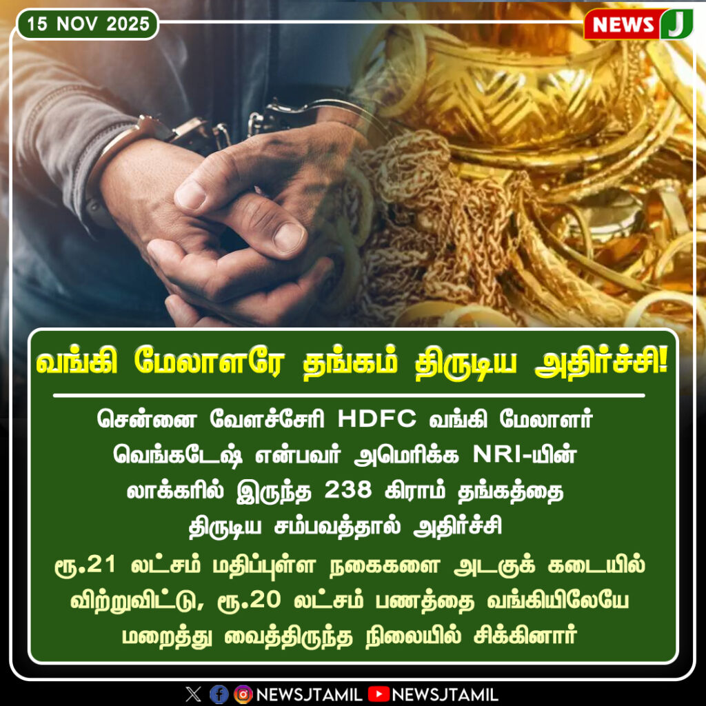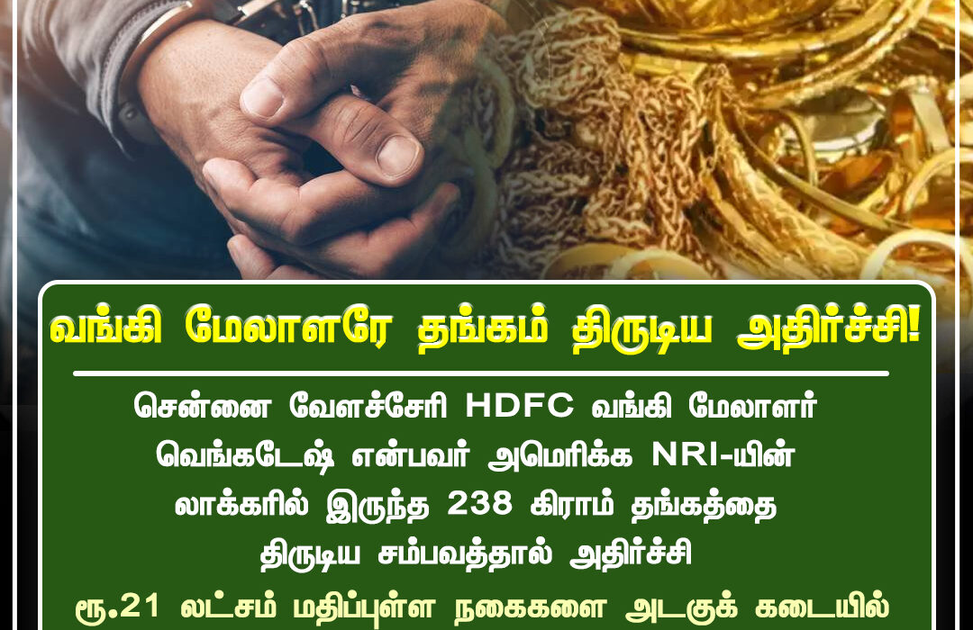 சென்னையின் வேளச்சேரி பகுதியில் உள்ள HDFC வங்கியில் பணியாற்றும் மேலாளர் ஒருவர் NRI வாடிக்கையாளரின் லாக்கரில் இருந்து 238 கிராம் தங்கம் காணாமல் போனதால் பதட்டம் ஏற்பட்டுள்ளது. வாடிக்கையாளர் புகாரின் பேரில் போலீசார் விசாரணை நடத்தி சம்பந்தப்பட்ட மேலாளரை கைது செய்துள்ளனர்.