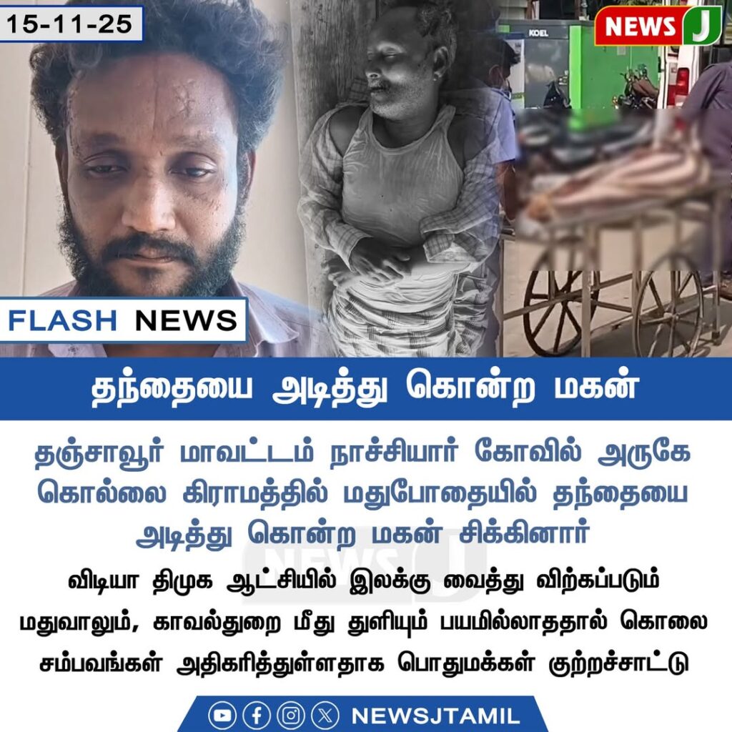 A shocking incident has unfolded near the Nachiyar Temple in Thanjavur district, where a man allegedly beat his father to death in a drunken altercation. According to reports, the argument escalated when the son, under the influence of alcohol, attacked his father fatally.