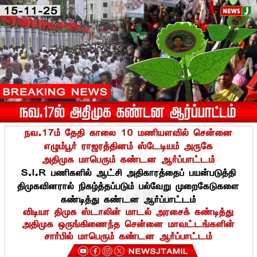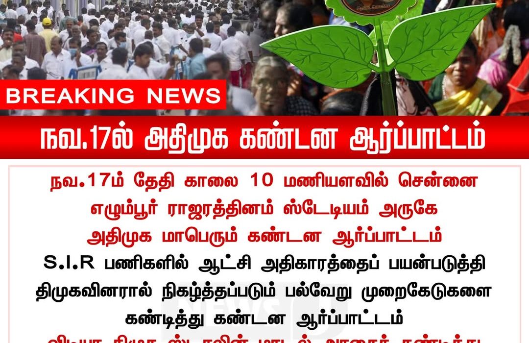 The ADMK has announced a large-scale protest scheduled for November 17 at 10 AM near Rajarathinam Stadium in Egmore, Chennai. The demonstration aims to highlight administrative failures, public grievances, and demands for urgent government action.